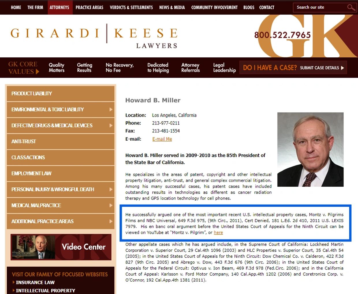 Montz & Smoller attorneys from the now-defunct GIRARDI KEESE Law Firm included founding partner Thomas V. Girardi (previously known as the "Billion Dollar Gentleman", now disbarred), Graham Lippsmith and GK partner and 85th President of the State Bar of California, Howard Miller.